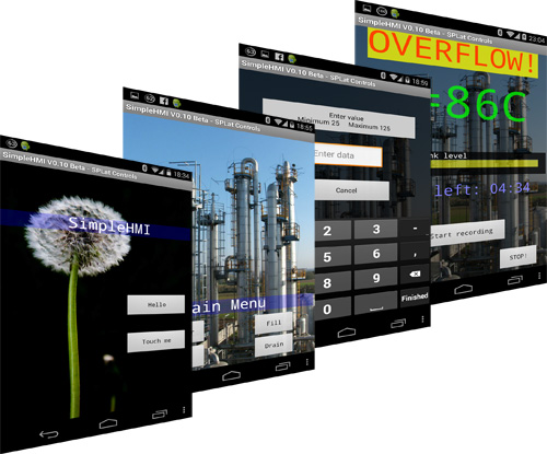 SimpleHMI is an app that runs in an Android phone or Windows PC. Everything that appears on the SimpleHMI screen is controlled by serial commands from the controller (SPLat or 3rd party). For example, to display some text the controller sends the text with a position and colour. For a button, it sends the size, position and text label, plus a code that is to be returned to the controller when the user clicks the button.