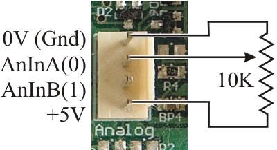 The following diagram shows the analog pinning and a potentiometer connected to one input.