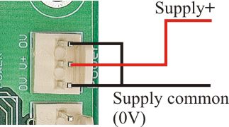 The above illustration shows the power connections to the CC18. We have used a 3-pin connector, to differentiate from 2-pin connectors used elsewhere on the board. There are two pins for 0V (gnd, common). You do not have to wire both to both 0V pins; either one will do. The wire shown in red above should go to the positive terminal of your power supply. The black wire should go to the ground or common terminal of the power supply (often labelled minus on a single voltage supply). See also ‘Some common terminology‘: