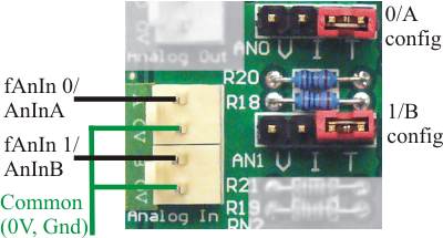 The analog inputs are designated as analog A and B in AnIn instructions or 0 and 1 in fAnIn instructions. It has a 4-pin configuration jumper field. A single jumper (shunt) on a pair of jumper pins selects the operating mode (V=voltage, I=current or T=temperature). The picture shows them both in temperature mode.