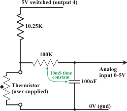 You will notice that there is a 10mS time constant in the measuring circuit. This is provided to filter out hum and other noise and reduce its impact on the reading accuracy. At the same time, the 5V drive voltage is switchable via output 4, to help reduce self-heating of the thermistor. Because of the time constant, when you switch on the drive voltage it will take some time for the reading to settle down. This means your program should turn on the output, wait long enough for the reading to settle, and only then take a reading. How long should this settling time be? About 7 time constants (70mS) to settle to 0.1% (which is 10-bit resolution).