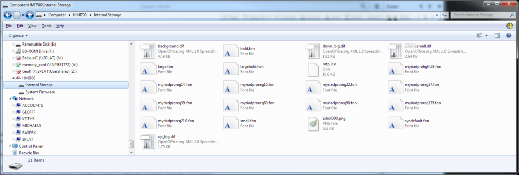 Within that folder is a file initially called “sshot000.png”. Drag that file to your desktop or a target location and the HMI firmware will automatically make a screenshot in this file. (The HMI700 generally takes some time to do this.) It will also increment the file name, so the next file will be called “sshot001.png”.