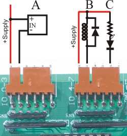 B: A relay coil. Notice we have included a catch diode across the coil. While there are diodes on the board we recommend a diode across the coil, as close as possible to the coil, to minimize problems with switching noise. A suitable diode is a 1N4001 or similar 1A/50V rectifier diode.