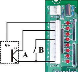 In the picture A is the output of an NPN style sensor connected to input 6. B is a simple switch connected to input 4. The sensor is getting its power from the XIRO16 input connector. See the manufacturer’s data for connection details of the sensor you are using. The terminal labeled with a minus sign above will be the manufacturer’s designated negative or common terminal, and the “O” terminal will be the designated output terminal of the sensor.