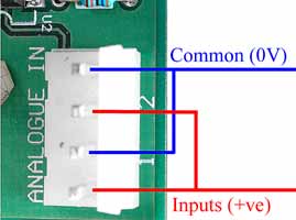 To use an analog input in voltage mode you set its jumper to bridge the two pins either side of the letter V and apply the input voltage between the input (positive) and the common (most negative). When an AnIn* instruction is executed, you will get a number between 0 and 255 in the X-register. 0 represents 0V and 255 represents 10V.
