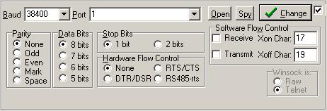 The baud rate should be set to 38.4kbps, no parity, 1 or 2 stop bits, no flow control.