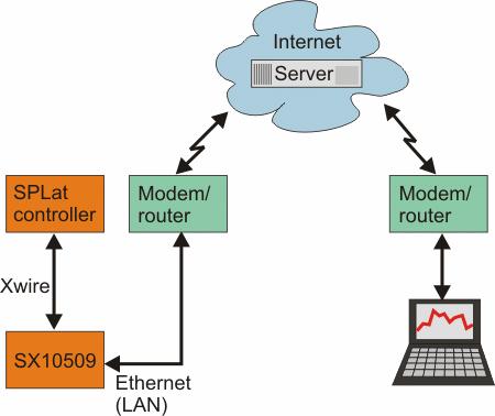 All data exchanges are initiated by the SPLat controller via the SX10509. The SX10509 will look just like a regular web browser. It will therefore (more often than not) get out through the local firewalls to the Internet, without the need for any special configuration of the LAN it is connected to. This “little trick” is why we call it SPLat Call Home. The SPLat always “calls home” to send (upload) data and ask for (download) instructions. The alternative would be to have a web server in the SX10509. That would however mean any remote contact requests would have to get in through a firewall. This could require significant network administration skills. It would also make the programming much more complicated.