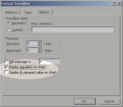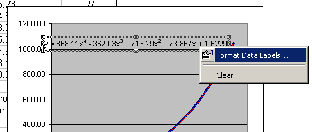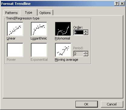 - In the trendline dialog box, select type = Polynomial and click the Order up to 4 (the latter may change later)