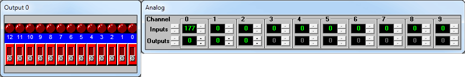 Here are the digital and analogue windows of SPLat/PC with an HMI430 connected.  We see the HMI430 has 9 digital I/O’s (8 I/O + beeper), 2 analogue inputs and 1 analogue output: