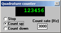 The window allows you to dial in a count rate up to 3kHz (realistic for 8-bit controllers such as the CC18, although 300kHz is more realistic for 32-bit controllers such as the DC216 and DT16), and have the counter count up or down or stop. When stopped you can also type a preset number of counts into the counter (green numbers). You will be prevented from entering invalid numbers.