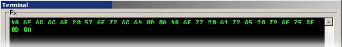 You will notice that the two iiPrintText instructions both have '0D,'0A at the end. These are carriage return (CR) and line feed (LF). They force the terminal to a new line, but are otherwise invisible. Now click the HEX button. The display will switch to showing raw character codes, in hexadecimal: