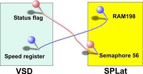 We have already determined the addresses in SPLat, as they are given in the diagram. Stated verbally “we want the value in SPLat’s RAM location 198 to control the speed of the VSD, and we want the VSD’s status flag to be available as semaphore 56″. Hence RAM 198 must be written from the SPLat to the VSD, and semaphore 56 must be read from the VSD.