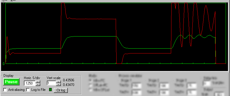 The green trace is the output of the process. The red trace is the output of the controller. There are 20 horizontal divisions. At the fastest Horizontal rate there are 500 samples per screen width, more at slower rates.