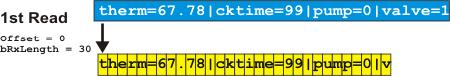 The diagram above shows the situation after the first Read command is echoed by the SX10509. The yellow boxes are the 30 bytes that contain data in the Xwire Rx data block in the SPLat. The white on blue text is the contents of the Network Rx buffer in the SX10509 board. The arrow shows where data is moved from. Carriage return characters are represented by pipe symbols |. To the left you can see the read offset that’s used in the SX10509 for this read, and the number of bytes reported in bRxLength.