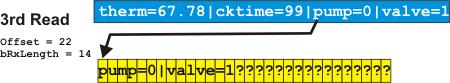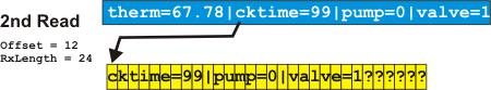 The second Read is performed with bSCH_RxBufferOffset=12, and the Read offset in the SX10509 also at 12. Hence the readout starts at the 13th character in the SX10509, which winds up in the 1st data byte of the Xwire Rx data block in the SPLat. This time, the reported byte count is only 24, as that is the number of characters actually transferred. This time the variable name cktime is extracted, along with its value, 99 (code not shown here). The number of bytes consumed is 10.