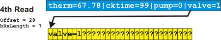 After the first Read, when the SPLat program checks if there is a recognizable variable name at the start of the Xwire Rx data block, it will find therm=. At the same time I will have been incremented so it “points” to the start of the value (courtesy of the magic of iiStrFind). The program then does a Branch to T3_Therm, the code required to handle the variable therm. This extracts the value (67.78) using a iifGetNum. iifGetNum, increments I by the number of characters processed in extracting the value.