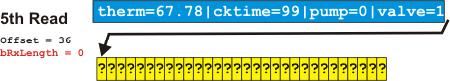 The fifth read returns nothing, because it is indexed past the end of the data. This is signalled in the bRxLength byte. You may recall that we test for this very condition near the top of the parsing loop.