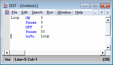 Now locate the Edit window of SPLat/PC. You are going to be typing your first program into that window, and then you are going to get the EC1 to run the program. Here’s what the Edit window looks like, with the first line of the program typed in.
