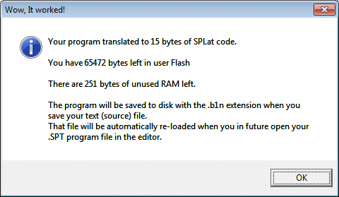 Now you are going to transfer the program to your EC1 board and run it. At the moment, it exists only as a bunch of text in the SPLat/PC editor. In that form it’s no use to the board — the program must be translated into the 1’s and 0’s that the board understands. You do this by invoking the Translate command under the File menu in SPLat/PC
