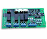 The IOX44 performs the dual functions of a 4-relay output board and a 4-channel input isolator. The relays can be driven off solid state SPLat outputs while the opto-isolated inputs must be connected to regular SPLat NPN style inputs. The board is compatible with all SPLat controllers which have “direct connect” NPN inputs and ground switching (NPN) transistor outputs.