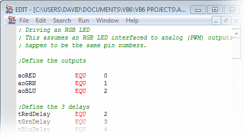 ; This assumes an RGB LED interfaced to analog (PWM) outputs 0, 1, and 2, which just