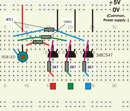 1. You may have noticed I used 100Ω for green but 47Ω for red and blue current limiting resistors. The reason is that in all the RGB LEDs I checked out, the green output is about twice the other two colours at the same current.
