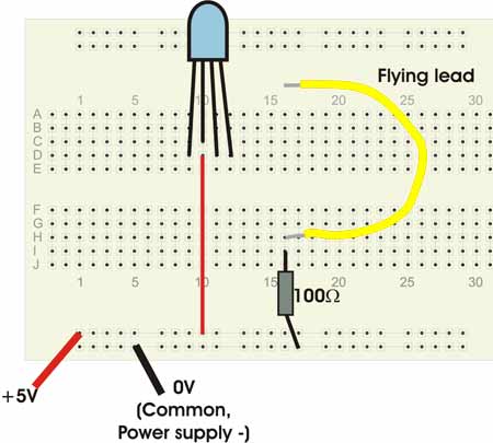 Caution: Be very careful that the wire with +5V on it touches nowhere but the terminals marked with coloured squares. Anywhere else could result in excessive smoke emissions and component failure.