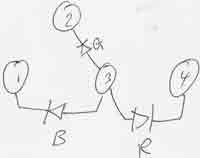 Study the breadboard layout above. Assuming I have correctly connected the common anode pin to +5V via the red wires, then touching each of the other pins with the yellow flying lead should light up one of the LEDs and identify the colour for that pin. Try it yourself! If you don’t get the expected result, try a different pin as the common. I did this work with a sample LED from a supplier, which came with an ambiguous pre-release data sheet. In the end I was getting confused and wound up drawing this diagram: