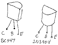 The transistor pins, Base, Collector and Emitter. Different transistors have different pin placements – the manufacturers like to keep us on our toes! Here are the pinouts for the two types I have suggested. You can see that one is a complete 180° rotation of the other!